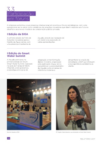 Stand da Aqualia na SIGA. Mª Angeles Vicente durante a sua intervenção no Smart Water Summit.