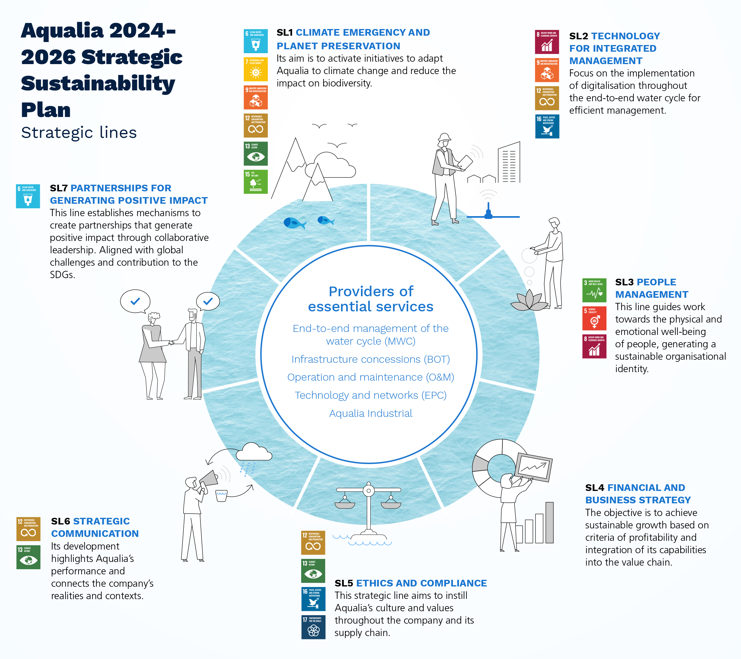 Aqualia’s 2024–2026 Strategic Sustainability Plan embodies the firm commitments that Aqualia has embraced in the daily running of the business. A pledge to sustainability as the way to generate a model of prosperity and wellbeing that will help to build a fairer, more humane and sustainable planet.