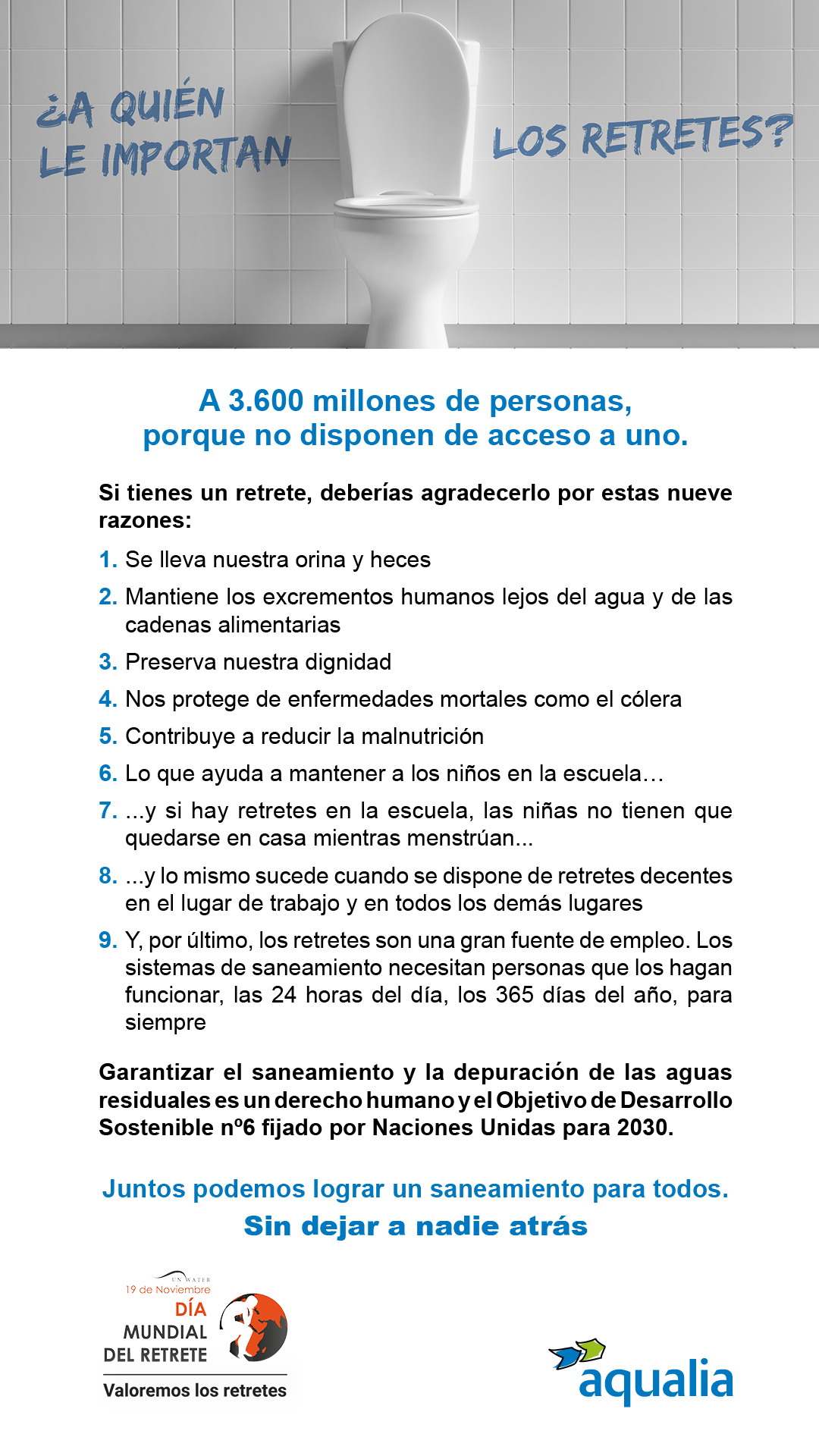 En el Día Mundial del Saneamiento, este año la ONU nos invita a reflexionar acerca de la importancia de disponer de retrete. Este sanitario se constituye en un elemento fundamental a la hora de preservar nuestra higiene, salud y dignidad. Pero no solo eso, sino que en muchos países constituye un condicionante a la hora de permitir la escolarización de las niñas una vez que tienen la menstruación y de la incorporación de la mujer al trabajo por el mismo motivo.