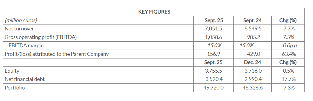The FCC Group recorded revenue of €7,051.5 million in the first nine months of the year, up 7.7% year on year. This result was driven by a balanced combination of acquisitions made by the Environment division in the United Kingdom, the United States and France during 2024, as well as by organic growth across all business areas. The Concessions division outperformed, posting growth of 38%, fuelled by the start-up of new contracts, followed by the Water division, which also recorded significant growth across its various lines of activity.