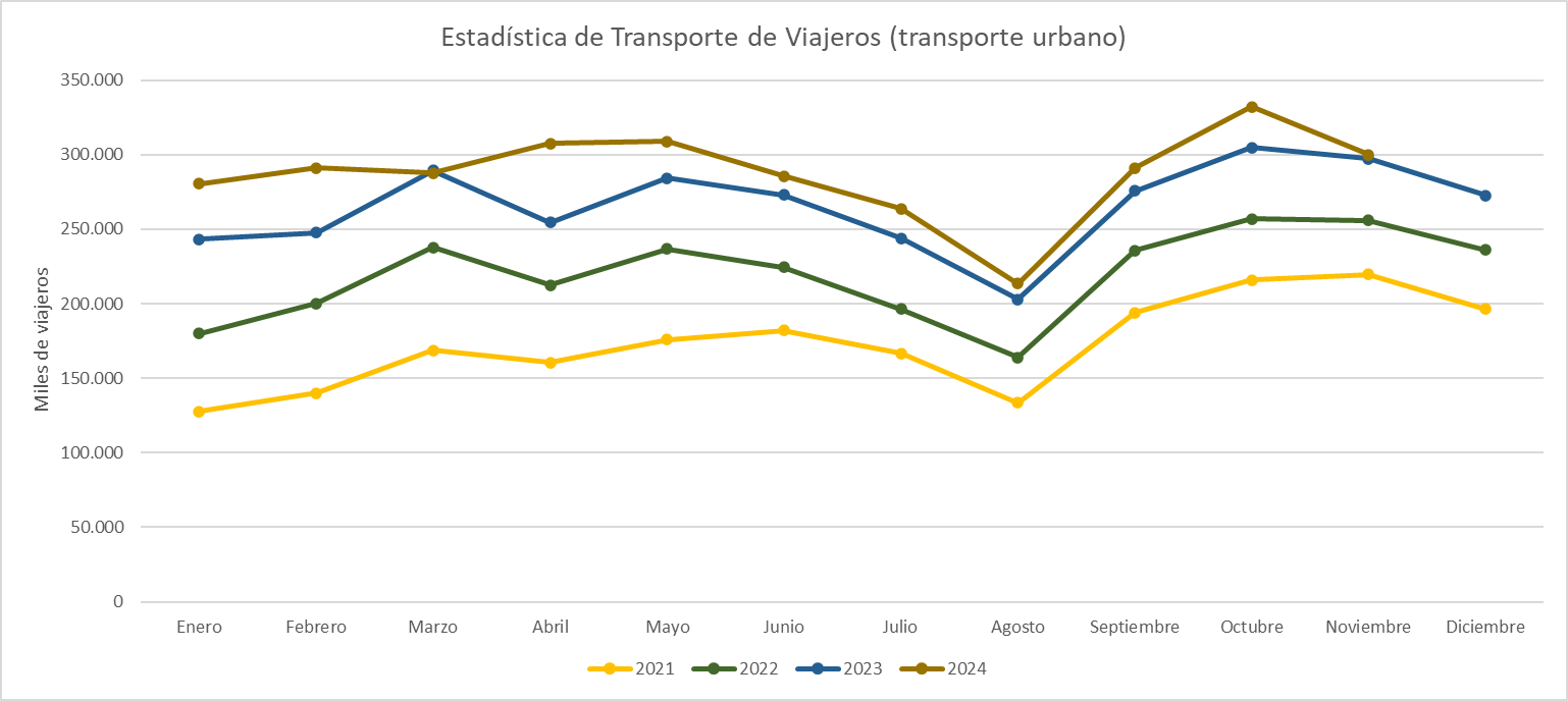 The month with the highest travel demand in 2024 was October with 945,081 trips and the month with the highest relative growth was January with 39% over the same month in 2023. In terms of daily travel demand, the record in a conventional working day took place on October 31 with 40,065 trips, only surpassed by two unique days, where two characteristics to take into account converged, local holidays with massive influx to the city center and free public transport, such as Tuesday April 2, the Bando de la Huerta, with 42. 826 trips and Saturday, April 6, the Burial of the Sardine with an absolute record of streetcar trips reaching 44,216 trips in this mode of high-capacity transport.