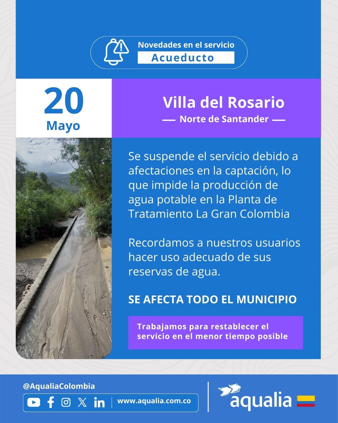 Se suspende el servicio debido a afectaciones en la captación, lo que impide la producción de agua potable en la Planta de Tratamiento La Gran Colombia.