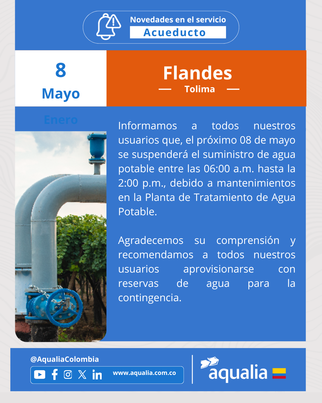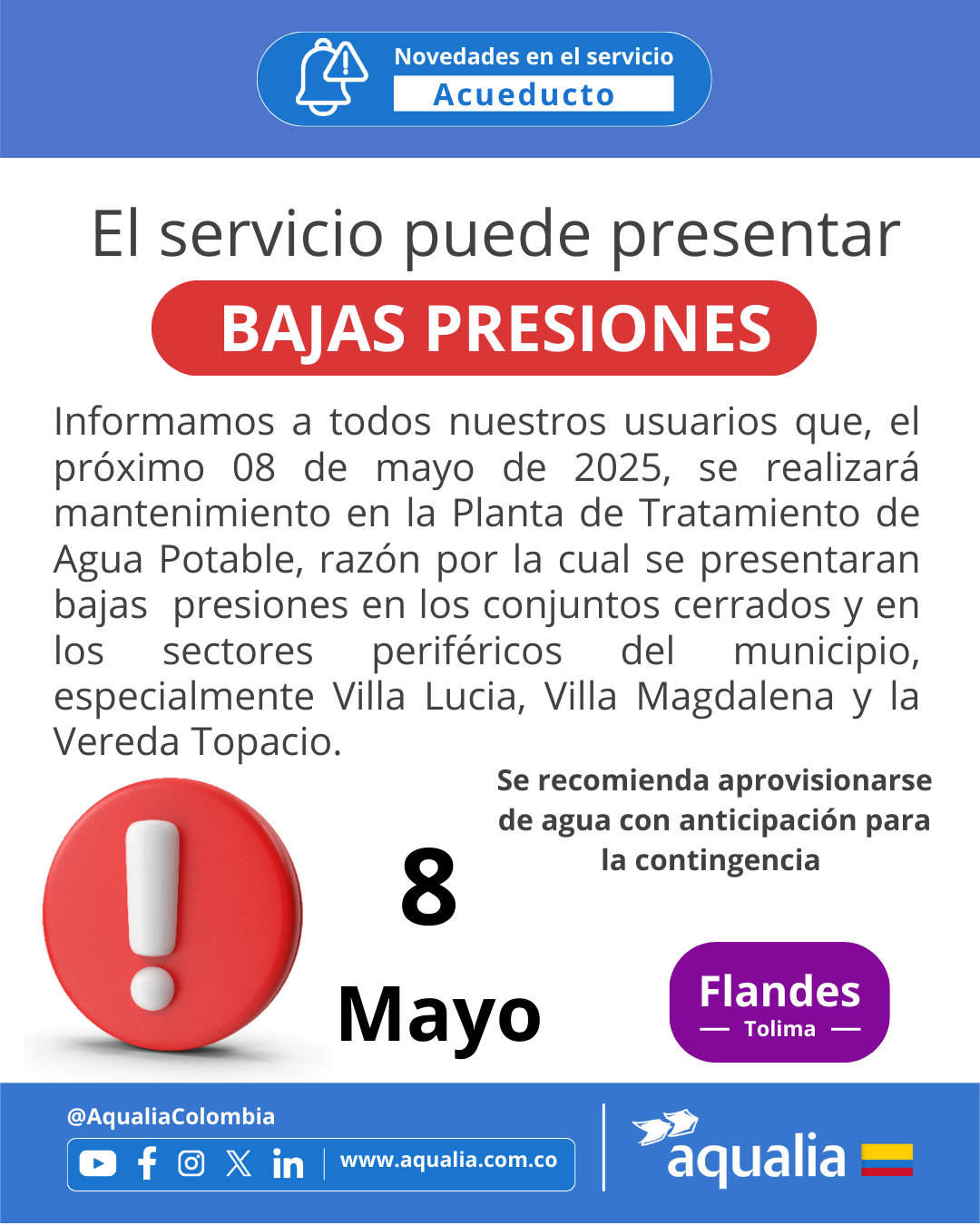 Novedades en la prestación del servicio de acueducto de Flandes para este 8 de mayo de 2025