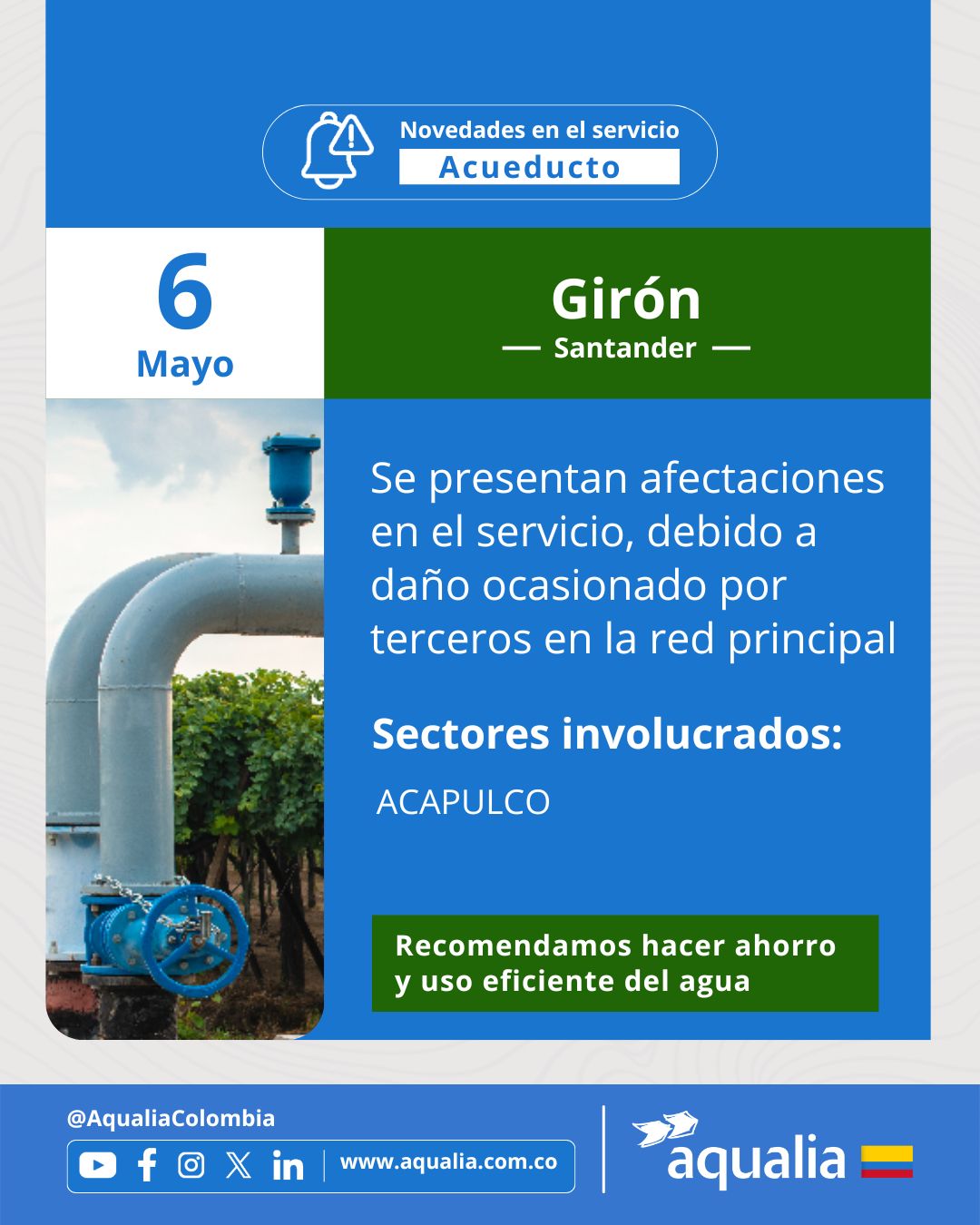 Informamos a todos nuestros usuarios que, el próximo 08 de mayo de 2025, se realizará mantenimiento en la Planta de Tratamiento de Agua Potable, razón por la cual se presentaran bajas presiones en los conjuntos cerrados y en los sectores periféricos del municipio, especialmente Villa Lucia, Villa Magdalena y la Vereda ...