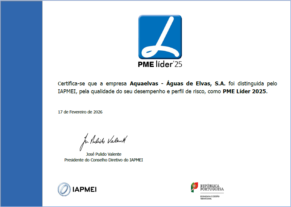 A Aquaelvas foi mais uma vez distinguida pelo IAPMEI com o Estatuto de PME Líder, edição de 2025, sinalizando a qualidade do seu desempenho e perfil de risco, bem como a importância do contributo para a economía nacional.