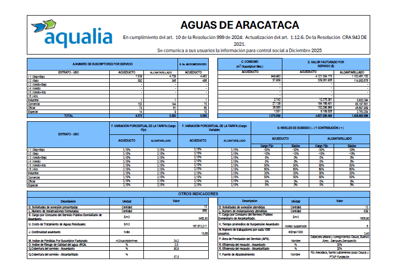 AGUAS DE ARACATACA S.A. E.S.P. En cumplimiento del art. 10 de la Resolución 999 de 2024: Actualización del art. 1.12.6. De la Resolución CRA 943 DE 2021. Se comunica a sus usuarios la información para control social a Diciembre 2025